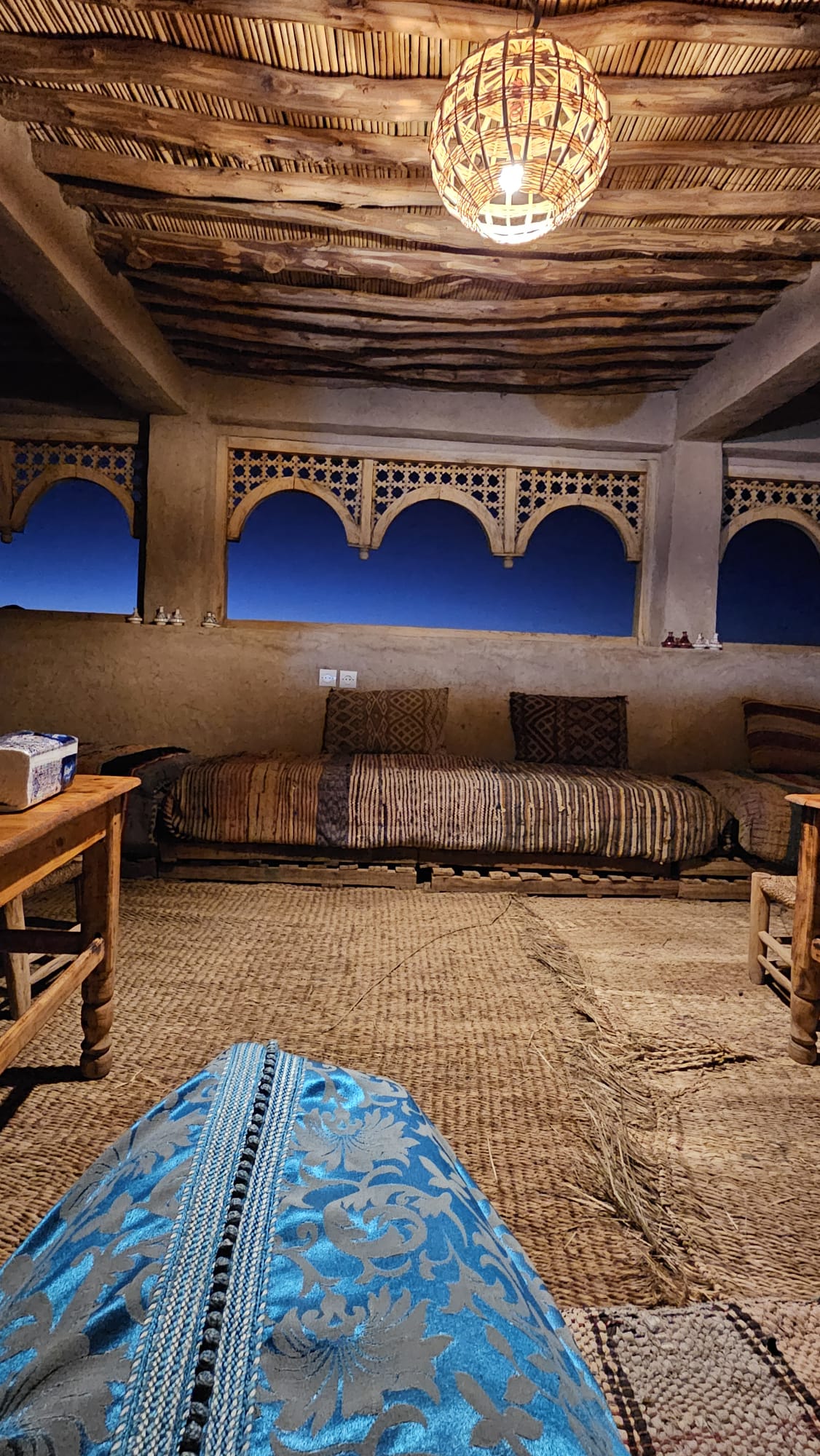 Las noches en la kasbah serán verdaderamente especiales, acompañadas por los ritmos de los tambores bereberes, danzas tradicionales y una cena festiva elaborada con ingredientes locales. Desde la terraza contemplaremos uno de los cielos más estrellados posibles. El amanecer aquí es casi místico, cuando el barro de las construcciones se funde con el sol y las colinas.